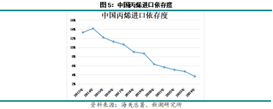 中国丙烯进口依存度自2014年开始便呈现下滑趋势,已经从2014年的14.2%下降至2024年的3.6%。从长期来看,随着中国丙烯产能的进一步释放,国内丙烯供应充足,对于丙烯进口的需求降低,中国丙烯的进口依存度预计将会进一步降低。