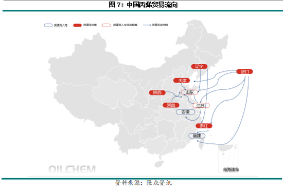 由于丙烯的运输存在难度,因此其货源流通多以近洋区域内自平衡为主,远距离跨区域流通量相对较小。