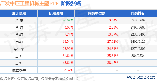 从业绩表现来看,广发中证工程机械主题ETF基金过去一年净值涨幅为10.06%,在同类基金中排名1221/2216,同类基金过去一年净值涨幅中位数为11.09%。而基金过去一年的最大回撤为-20.51%,成立以来的最大回撤为-20.51%。