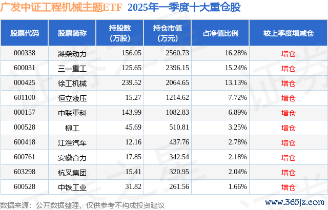 从基金规模来看,广发中证工程机械主题ETF基金2025年一季度公布的基金规模为1.57亿元,较上一期规模9957.57万元变化了5767.62万元,环比变化了57.92%。该基金最新一期资产配置为:股票占净值比99.42%,无债券类资产,现金占净值比1.69%。从基金持仓来看,该基金当季前十大股票仓位达71.17%,第一大重仓股为潍柴动力(000338),持仓占比为16.28%。