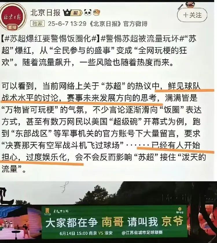可就在全民狂欢的时候,《北京日报》突然泼了一盆冷水,说苏超“过度娱乐化”“滑向饭圈表达”,甚至担心它变成“空洞狂欢”。