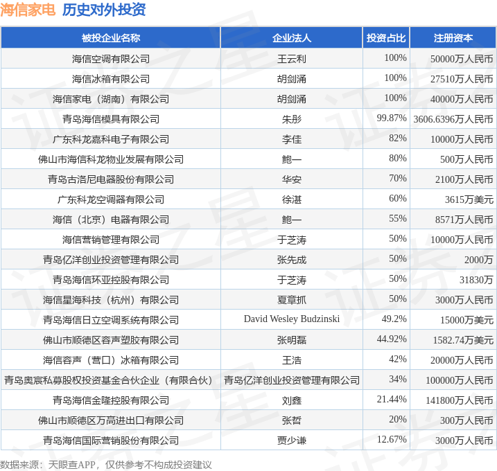 本站消息,根据天眼查APP显示,海信家电(000921)新增一起对外投资事件浩源配资,被投资公司为海信家电集团股份有限公司,法定代表人高玉玲,投资占比为0.95%。该公司从事计算机、通信和其他电子设备制造业,注册资本为138716.737万人民币。目前浩源配资,海信家电共存在对外投资26项,投资占比前20的项目见下表: