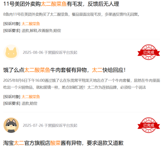 今年9月,太二还卷入“活鱼现杀”争议,有网友质疑太二酸菜鱼为预制菜优配货主,而在黑猫投诉 【下载黑猫投诉客户端】平台中,部分投诉内容显示,消费者通过外卖平台下单太二菜品后,发现餐品中含有异物。