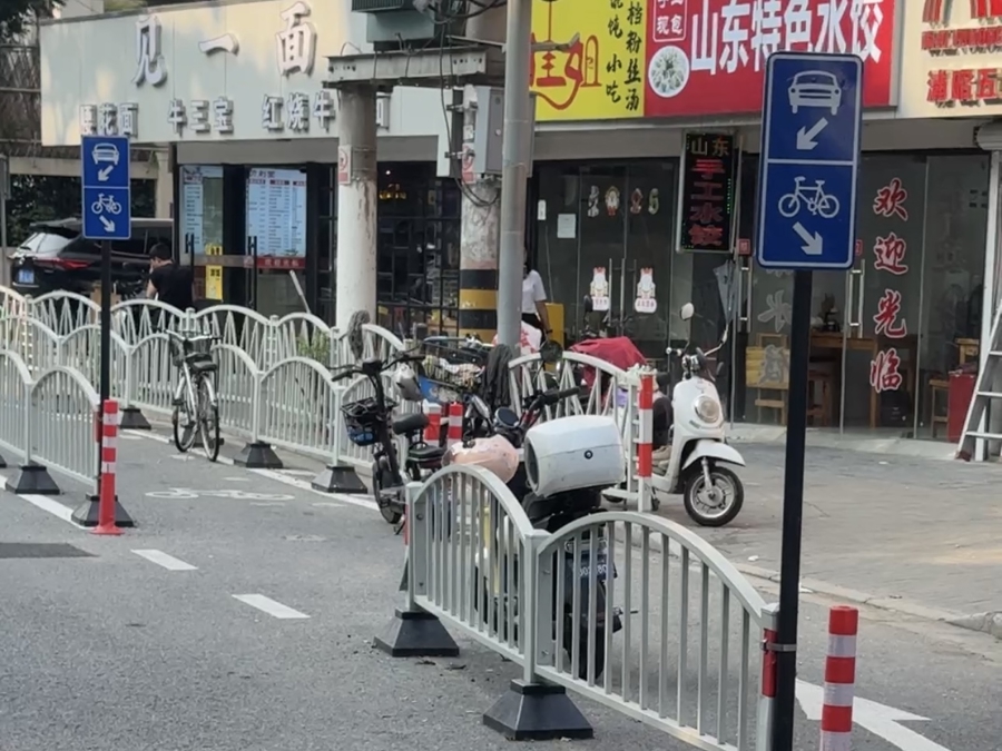 非机动车道有两道高低栅栏,本意是为了防止非机动车停靠占道。