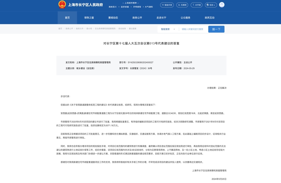 长宁区房管局针对区人大代表关于武夷路至延安西路中间的“安西路”整体路段拓宽工作的回复。(资料图片)